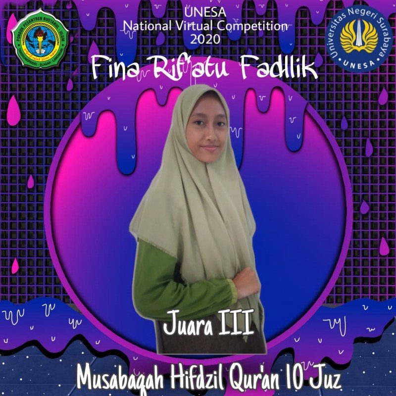 kepada ananda Fina Rif'atu Fadllik, Santri MA Bustanul Ulum. Yang telah memperoleh juara 3 National Virtual Competition Musabaqah Hifdzil Qur'an 10 Juz, yang diselenggarakan oleh Universitas Negeri Surabaya.